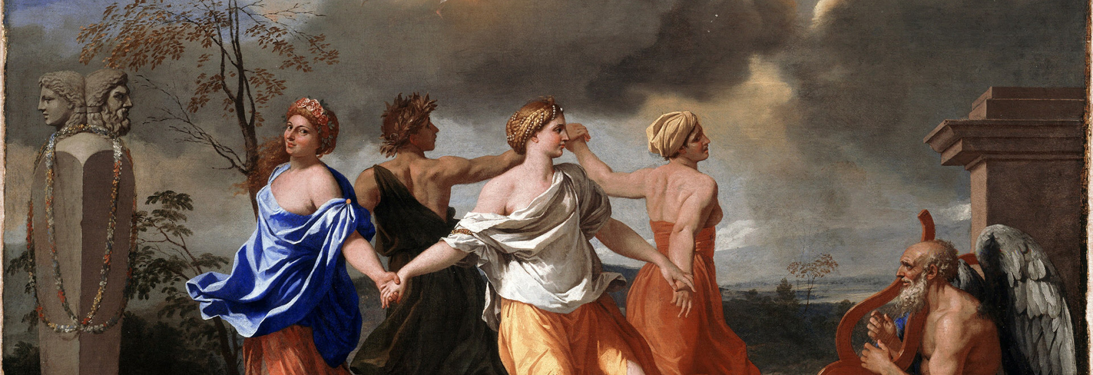 Cuatro figuras bailan en ronda al son de la música de lira que tañe un anciano alado, enmarcados por dos putti o amorcillos, mientras un carro sobrenatural cruza el cielo, más arriba. El anciano responde a la representación tradicional del Tiempo; un señor entrado en años, con un cuerpo que no coincide con su cabeza; denota su poder, y alas… porque el tiempo vuela.