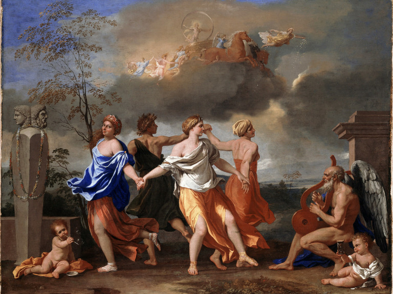 Veamos otra obra de la cual podemos extraer información comparando el cuadro final con su boceto. En este caso estamos ante “La danza del tiempo” o “La danza de la vida humana”, de Nicolas Poussin, artista del barroco francés, pintada entre 1638-40.