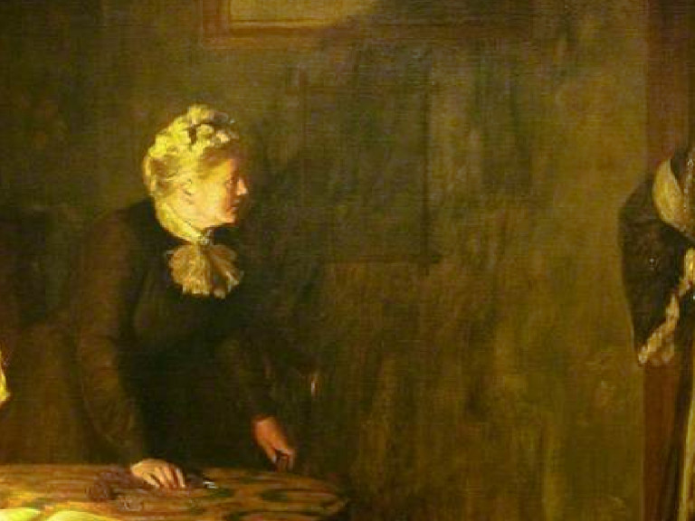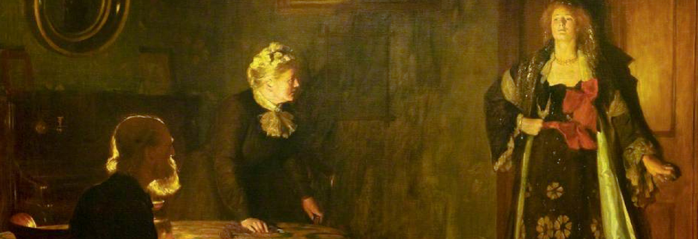 La pregunta es, ¿con qué luz deseó John Collier que viéramos a su “hija pródiga”? ¿La de quién merece el rechazo, como se estilaba en esa época en la pintura sobre “mujeres caídas”? ¿O la de quien es recibida con un festín, incluso si no ha vuelto arrepentida? Y ya que hablamos de luces –otra analogía que podemos establecer con el gran maestro de la luz, Rembrandt–, veamos las de nuestro cuadro. La iluminación proviene de alguna lámpara sobre la mesa, dispuesta para la lectura de ese texto, acaso religioso, que pronunciaba el padre antes de la irrupción. Su figura no nos deja verla; solo la apreciamos a través del contraluz que expone su figura, y que revela su barba y cabellera rala. Su esposa se ha levantado, sobresaltada, con mirada ansiosa; su sombra tenue cubre parte de la pared. La de la hija, lo mismo que su gesto, es neta y determinada.