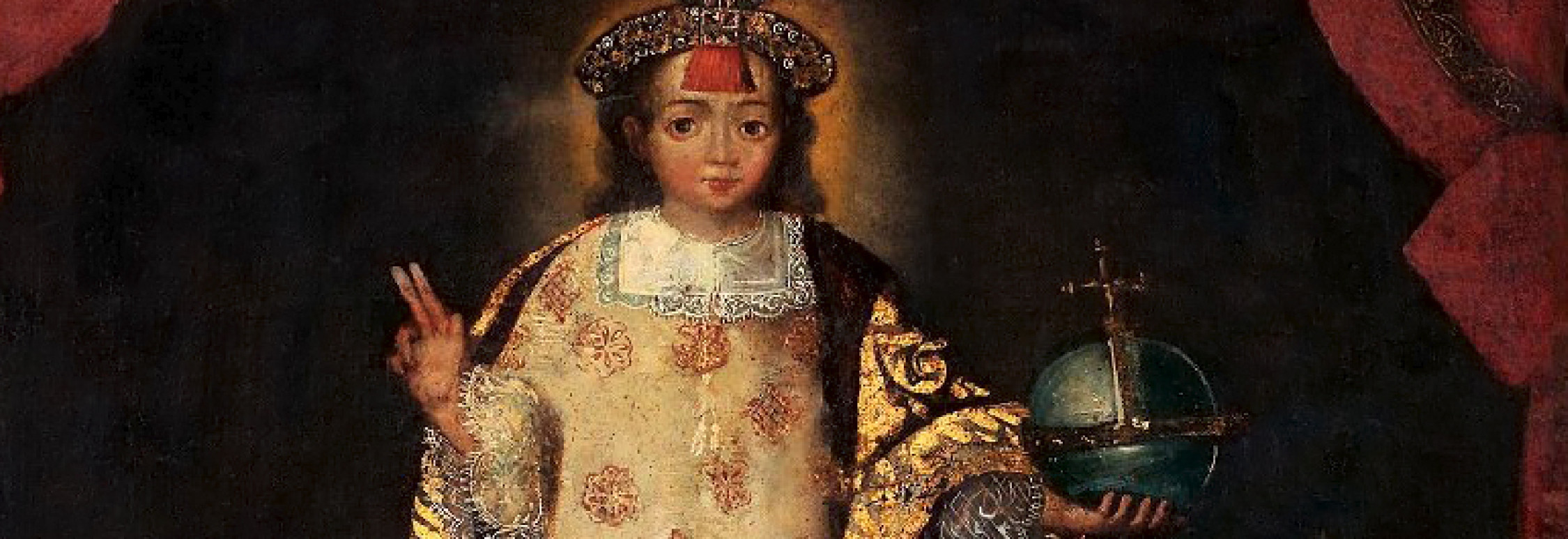 Muchas de ellas presentaban a Jesús en la forma de un pequeño salvador vestido a la manera tradicional con túnica y manto, sosteniendo el mundo entre sus manos. Pero vemos que algunos ejemplares diferentes lo presentan con el atuendo característico del rey inca, con una especie de bata recamada en láminas de oro, manto, sandalias típicamente andinas y el atributo incaico mascaypacha, el equivalente de las coronas que portaban los reyes europeos. Y, como es frecuente en los ejemplos españoles e italianos, sostiene el mundo con su mano derecha.